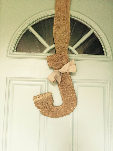 I had this wood letter (from Michaels $4) laying in my craft bin for two years and decided to finally use it. I decided to turn it into a door hanger. I bought a package to jute for $1 at Dollar Tree and I wrapped...and wrapped...and wrapped...(much like an embalmer dressing a mummy).